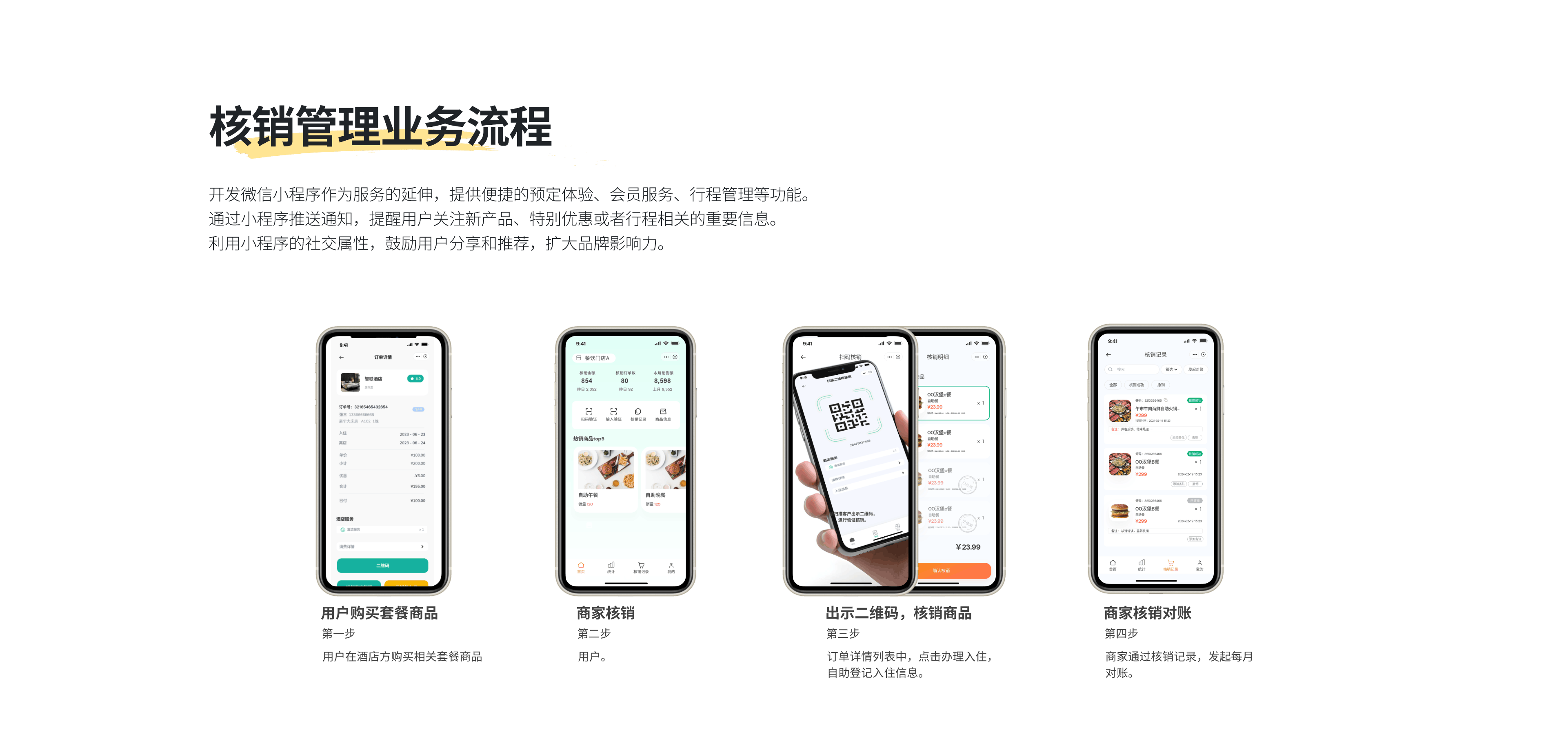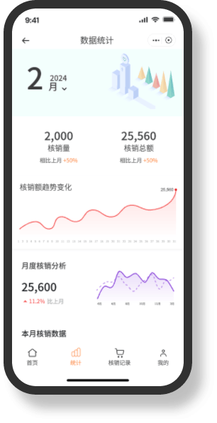 小程序自动记录所有核销信息,并与酒店的财务系统同步,商家。